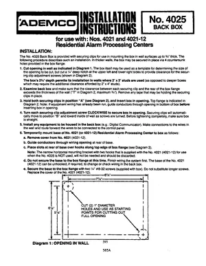 Installation Manual for the Ademco 4025, 4021 and 4021-12, published in 1983. Document No: P8833, Rev: 585B. Models 4025, 4021 and 4021-12. Physical installation guide, backbox dimensions, and cabling specifications.