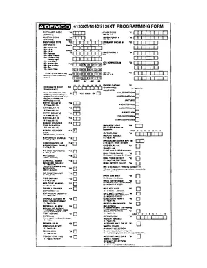 Manual for the Ademco 4130XT, 4140, and 5130XT Programming Form, published in 1989. Document No: XAT-PR. 13 models including 4130XT, 4140, 5130XT and 10 additional variants. System overview, features and capabilities, and basic operation.