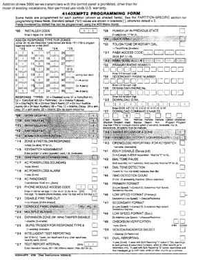 Manual for the Ademco 4140XMPT2 PROGRAMMING FORM, published in 1996. Document No: N5944-9PR, Rev: 4/96. 5 models including 4140XMPT2, 5800 Series, 4280 and 2 additional variants. System overview, features and capabilities, and basic operation.