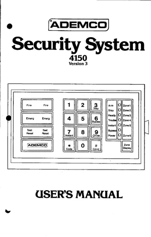 User Guide for the Ademco 4150, published in 1987. Document No: P9987-2V1, Rev: 3. Model 4150. Operator guide, alarm response procedures, and system status monitoring.