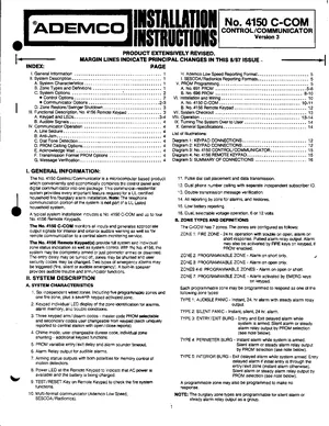 Installation and Programming Manual for the Ademco 4150 C-COM, published in 1987. Document No: P9988-2V1, Rev: Version 3. 24 models including 4150 C-COM, 4156, 691 and 21 additional variants. Physical installation procedures and comprehensive software setup guide.
