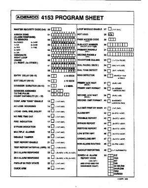 Manual for the Ademco 4153 Program Sheet, published in 1988. Document No: 4153PR. Model 4153. Capabilities, specifications summary, and usage notes.