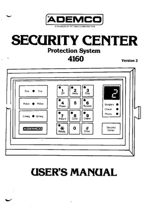 User Guide for the Ademco 4160, published in 1987. Document No: P9781V2, Rev: 3. Model 4160. Operator guide, alarm response procedures, and system status monitoring.