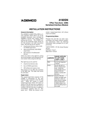 Installation Manual for the Ademco 4190SN, published in 1998. Document No: N6450-1. Model 4190SN. Physical installation guide, backbox dimensions, and cabling specifications.