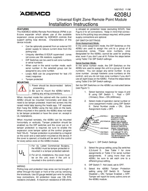 Installation and Programming Manual for the Ademco 4208U, published in 1997. Document No: N8215V2. Models 4208U and EOL100. Hardware mounting and wiring instructions alongside detailed system programming and configuration.