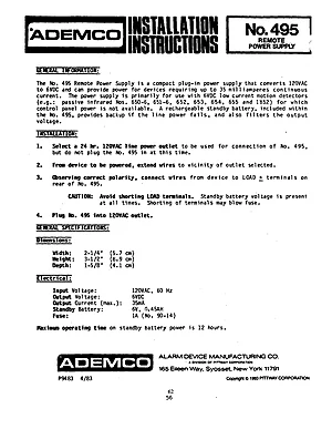 Installation Manual for the Ademco 495, published in 1983. Document No: P9483. Model 495. Physical installation guide, backbox dimensions, and cabling specifications.
