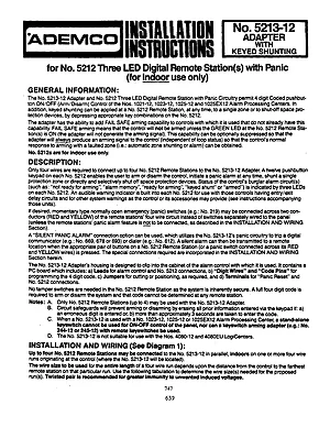 Installation Manual for the Ademco 5213-12 and 5212. Document No: 5213-12. Models 5213-12 and 5212. Mounting instructions, wiring diagrams, and system power-up procedures.