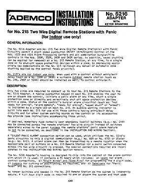 Installation Manual for the Ademco 5216 and 215. Document No: 5216. Models 5216 and 215. Hardware installation, terminal connections, and environmental requirements.