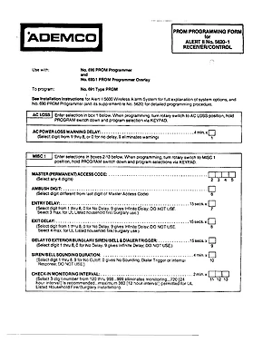 Programming Manual for the Ademco 5620-1, published in 1987. Document No: P7844PF1V2. Model 5620-1. Software programming guide, option settings, and network configuration.