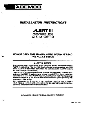 Installation Manual for the Ademco 5700, published in 1990. Document No: N4471V2. Model 5700. Hardware installation, terminal connections, and environmental requirements.