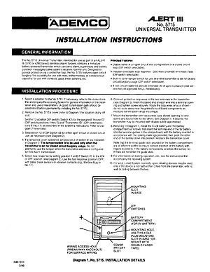 Installation Manual for the Ademco 5715, published in 1989. Document No: N4615V1. Model 5715. Hardware installation, terminal connections, and environmental requirements.