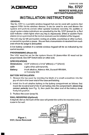 Installation Manual for the Ademco 5727, published in 1998. Document No: N3950-5V2. Model 5727. Hardware installation, terminal connections, and environmental requirements.