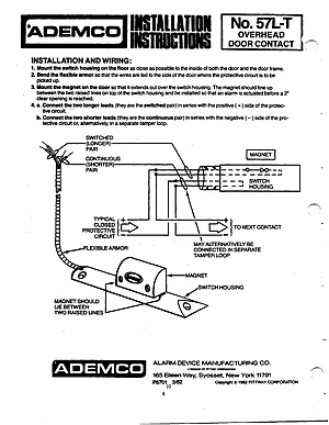 Installation Manual for the Ademco 57L-T, published in 1982. Document No: P8701. Model 57L-T. Physical installation guide, backbox dimensions, and cabling specifications.