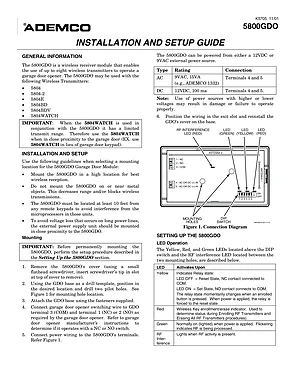 Installation Manual for the Ademco 5800GDO, published in 2001. Document No: K5705. Model 5800GDO. Mounting instructions, wiring diagrams, and system power-up procedures.