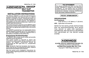 Installation Manual for the Ademco 5802CP, published in 1994. Document No: N6555, Rev: B. Model 5802CP. Physical installation guide, backbox dimensions, and cabling specifications.