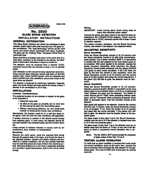 Installation Manual for the Ademco No.2500 Glass Break Detector, published in 1992. Document No: N5885-3, Rev: 2/92. Model 2500. Physical installation guide, backbox dimensions, and cabling specifications.