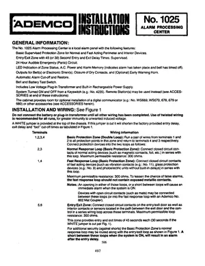Installation and Operations Manual for the Ademco No. 1025 Alarm Processing Center, published in 1981. Document No: P8363, Rev: 12/81. 34 models including 1025, 4235, WS669 and 31 additional variants. Hardware mounting, wiring, and user system management.
