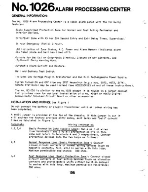 Installation Manual for the Ademco No. 1026 Alarm Processing Center. 27 models including 1026, BC1026, 706 and 24 additional variants. Physical installation guide, backbox dimensions, and cabling specifications.