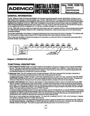 Installation and Operations Manual for the Ademco No. 1038 & 1038-12 Contact Indentification Annunciator, published in 1983. Document No: P8865V1YY. 47 models including 1038, 1038-12, 1039 and 44 additional variants. Hardware mounting, wiring, and user system management.