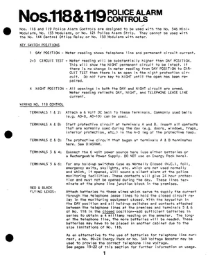 Installation and Operations Manual for the Ademco No. 118 & 119 Police Alarm Controls. 14 models including 118, 119, 546 and 11 additional variants. Hardware mounting, wiring, and user system management.