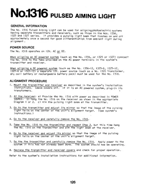 Installation Manual for the Ademco No. 1316 Pulsed Aiming Light. 10 models including 1316, 1356, 1325 and 7 additional variants. Mounting instructions, wiring diagrams, and system power-up procedures.