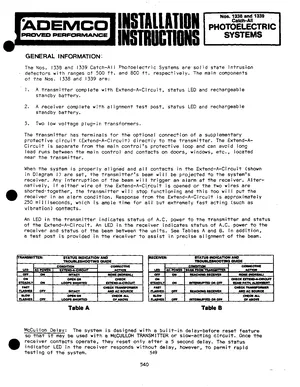 Installation Manual for the Ademco No. 1338 and 1339 Catch All Photelectric System, published in 1981. Document No: P4918 V1, Rev: A. 9 models including 1338, 1339, 1320 and 6 additional variants. Mounting instructions, wiring diagrams, and system power-up procedures.