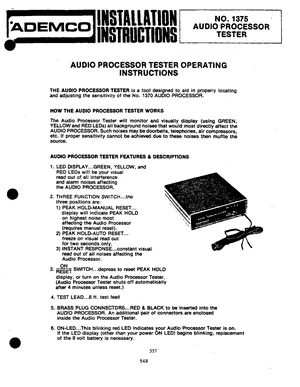 Installation and Operations Manual for the Ademco No. 1375 Audio Processor Tester, published in 1982. Document No: V1375558/82. Models 1375 and 1370. Hardware mounting, wiring, and user system management.