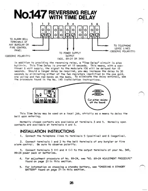 Installation Manual for the Ademco No. 147 Reversing Relay With Time Delay. 5 models including 147, 89-24, 349 and 2 additional variants. Physical installation guide, backbox dimensions, and cabling specifications.