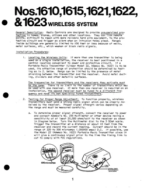 Installation Manual for the Ademco No. 1610, 1615, 1621, 1622, 1623 Wireless System. 10 models including 1610, 1615, 1621 and 7 additional variants. Mounting instructions, wiring diagrams, and system power-up procedures.