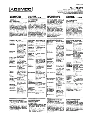 Installation and Operations Manual for the Ademco No. 1875EX Passive Infrared Motion Detector, published in 1996. Document No: N1248-1V4. Models 1875EX and AD-1875EX. System mounting procedures and sensitivity settings and daily operating instructions.