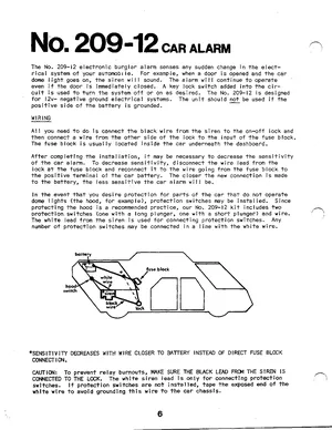 Installation Manual for the Ademco No. 209-12 Car Alarm. Model 209-12. Physical installation guide, backbox dimensions, and cabling specifications.