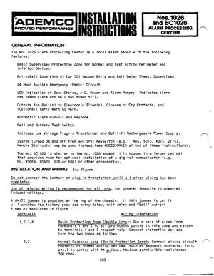 Installation and Operations Manual for the Ademco Nos. 1026 and BC1026 Alarm Processing Centers. 33 models including 1026, BC1026, 5073 and 30 additional variants. Complete setup guide and operational workflows.