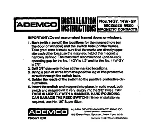 Installation Manual for the Ademco Nos. 14GY & 14W-GY Recessed Reed Magnetic Contacts, published in 1982. Document No: P2656V1. Models 14GY and 14W-GY. Physical installation guide, backbox dimensions, and cabling specifications.