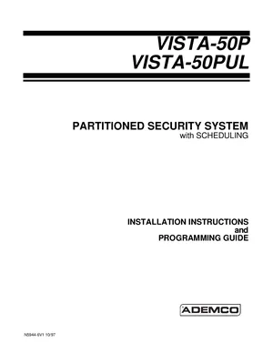 Installation, Operations, and Programming Manual for the Ademco VISTA-50P and VISTA-50PUL, published in 1997. Document No: N5944-6V1. 52 models including VISTA-50P, VISTA-50PUL, 6139 and 49 additional variants. Complete system installation, daily operation procedures, and detailed programming configurations.