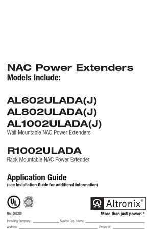 Application Guide for the Altronix NAC Power Extenders, published in 2020. Document No: 02ULADA, Rev: 062320. 7 models including AL602ULADA, AL602ULADAJ, AL802ULADA and 4 additional variants. Mounting and wiring instructions, user operating guides, and system software setup.