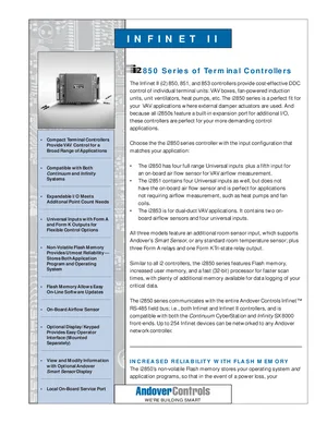 Datasheet for the Andover Controls 850 Series Terminal Controllers, published in 2004. Document No: DS-I-I2850-D, Rev: D. Models i2850, i2851 and i2853. Product features, environmental operating limits, and compatibility data.