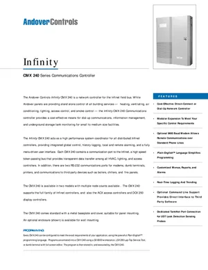 Datasheet for the Andover Controls CMX 240 Series Communications Controller, published in 1998. Document No: DS-240-B, Rev: B. 4 models including CMX 240, CMX 241, CMX 245 and 1 additional variants. Engineering specifications, wiring diagrams, and mounting dimensions.