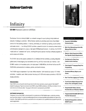 Datasheet for the Andover Controls CX 9001, published in 1996. Document No: DS-9001-3.96. 5 models including CX 9001, CX 9101, DCX 250 and 2 additional variants. Detailed technical specifications, electrical ratings, and agency listings.