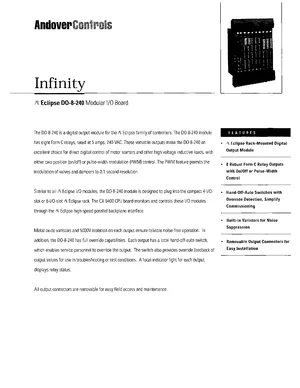 Datasheet for the Andover Controls DO-8-240, published in 1996. Document No: DS-DO-8-240-3.95, Rev: 3.95. Model DO-8-240. Product features, environmental operating limits, and compatibility data.