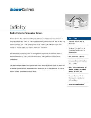 Datasheet for the Andover Controls Duct & Immersion Temperature Sensors, published in 2000. Document No: DS-D&ISensor-B, Rev: B. 7 models including TT-D-4-1, TT-D-6-1, TT-D-9-1 and 4 additional variants. Detailed technical specifications, electrical ratings, and agency listings.