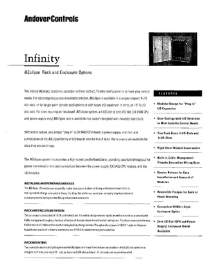 Datasheet for the Andover Controls Eclipse Rack and Enclosure Options. Model CX 9400. Detailed technical specifications, electrical ratings, and agency listings.