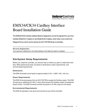 Installation Manual for the Andover Controls EMX34 and CK34, published in 1996. Document No: 30-3001-494, Rev: A. 6 models including EMX34, CK34, L47 and 3 additional variants. Hardware installation, terminal connections, and environmental requirements.