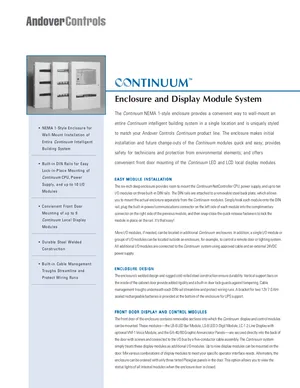 Datasheet for the Andover Controls Continuum Enclosure and Display, published in 1998. Document No: DS-ENCLOSURE-A, Rev: A. 4 models including ENCL-0DISP, ENCL-3DISP, ENCL-6DISP and 1 additional variants. Detailed technical specifications, electrical ratings, and agency listings.