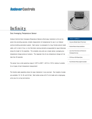 Datasheet for the Andover Controls Infinity Duct Averaging Sensors, published in 1998. Document No: DS-DuctAverage-A, Rev: A. 4 models including 01-6013-039, 01-6013-040, 01-6013-035 and 1 additional variants. Product features, environmental operating limits, and compatibility data.