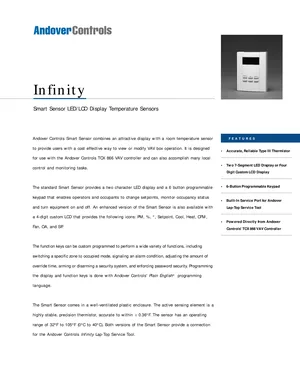 Datasheet for the Andover Controls Smart Sensor, published in 1998. Document No: DS-SmartSensor-B, Rev: B. Models TTS-SD-LED-1 and TTS-SD-LCD-1. Product features, environmental operating limits, and compatibility data.