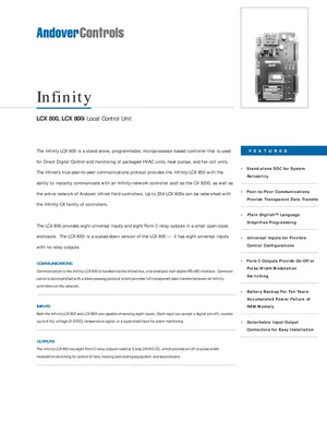Datasheet for the Andover Controls LCX 800 and LCX 800i, published in 2000. Document No: DS-800/800i-D, Rev: D. Models LCX 800 and LCX 800i. Engineering specifications, wiring diagrams, and mounting dimensions.