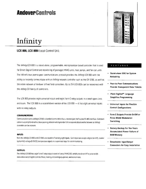 Datasheet for the Andover Controls LCX 800 and LCX 800i, published in 1998. Document No: DS-800/800i, Rev: 3.96. Models LCX 800 and LCX 800i. Engineering specifications, wiring diagrams, and mounting dimensions.