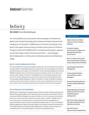 Datasheet for the Andover Controls SX 8000, published in 1999. Document No: DS-SX 8000-D, Rev: D. Model SX 8000. Product features, environmental operating limits, and compatibility data.
