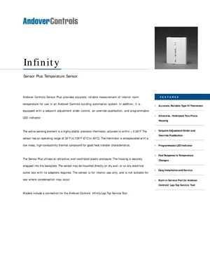 Datasheet for the Andover Controls TTS-SE, published in 1998. Document No: DS-SensorPlus, Rev: A. 5 models including TTS, SE, TTS-SE-1 and 2 additional variants. Product features, environmental operating limits, and compatibility data.