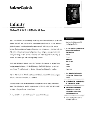 Datasheet for the Andover Controls UI-32-16 and UI-16-16. Models UI-32-16 and UI-16-16. Product features, environmental operating limits, and compatibility data.